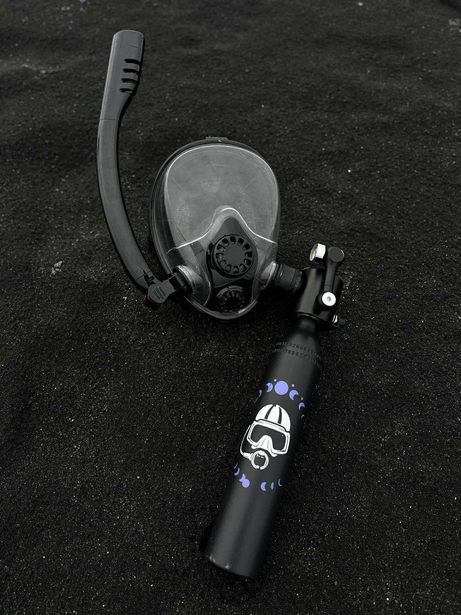 vysokotlaká pumpička s filtrem, vzduchová nádrž o objemu 0,5 litru s ventilem, celo-obličejová maska se šnorchlem, adaptér na propojení masky a lahve